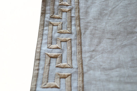 Custom curtains in ivory linen with exquisitely embroidered Greek key trim. Backed by pure cotton lining, these high quality curtains are suitable for any room.