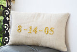 Personalized burlap throw pillows to remember a special day in your life. Cushion covers customized with date embroidered from sequins and beads. Great for weddings, anniversaries, graduation, birthdays etc.