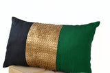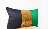 Throw pillow in emerald green, black and gold color block with sequin bead detail on art silk. This elegant decorative lumbar pillow is intricately beaded in gold squares and beads to form a solid gold pattern that creates a dazzling statement.