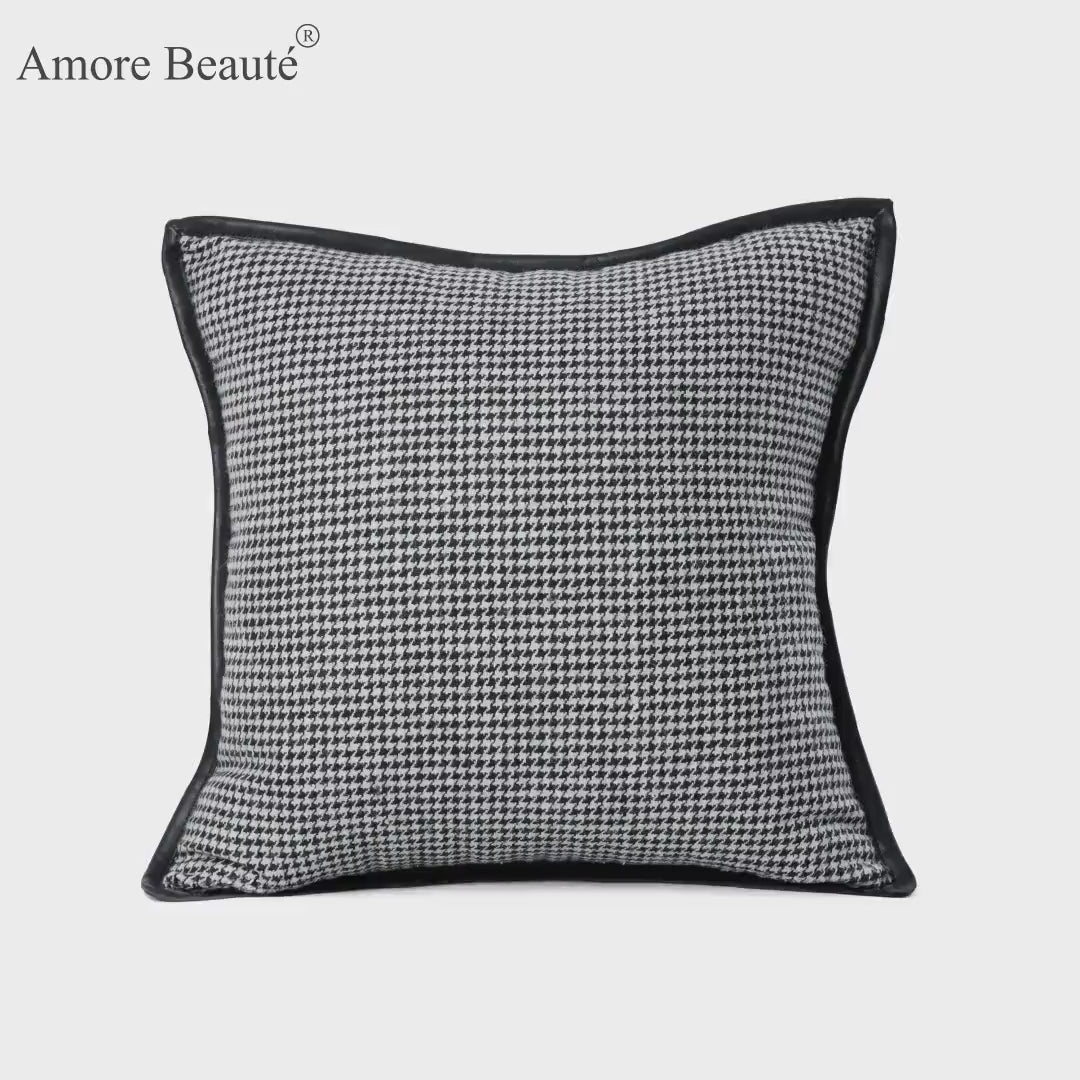 Black and White Houndstooth Pillow Cover with Leather Trim