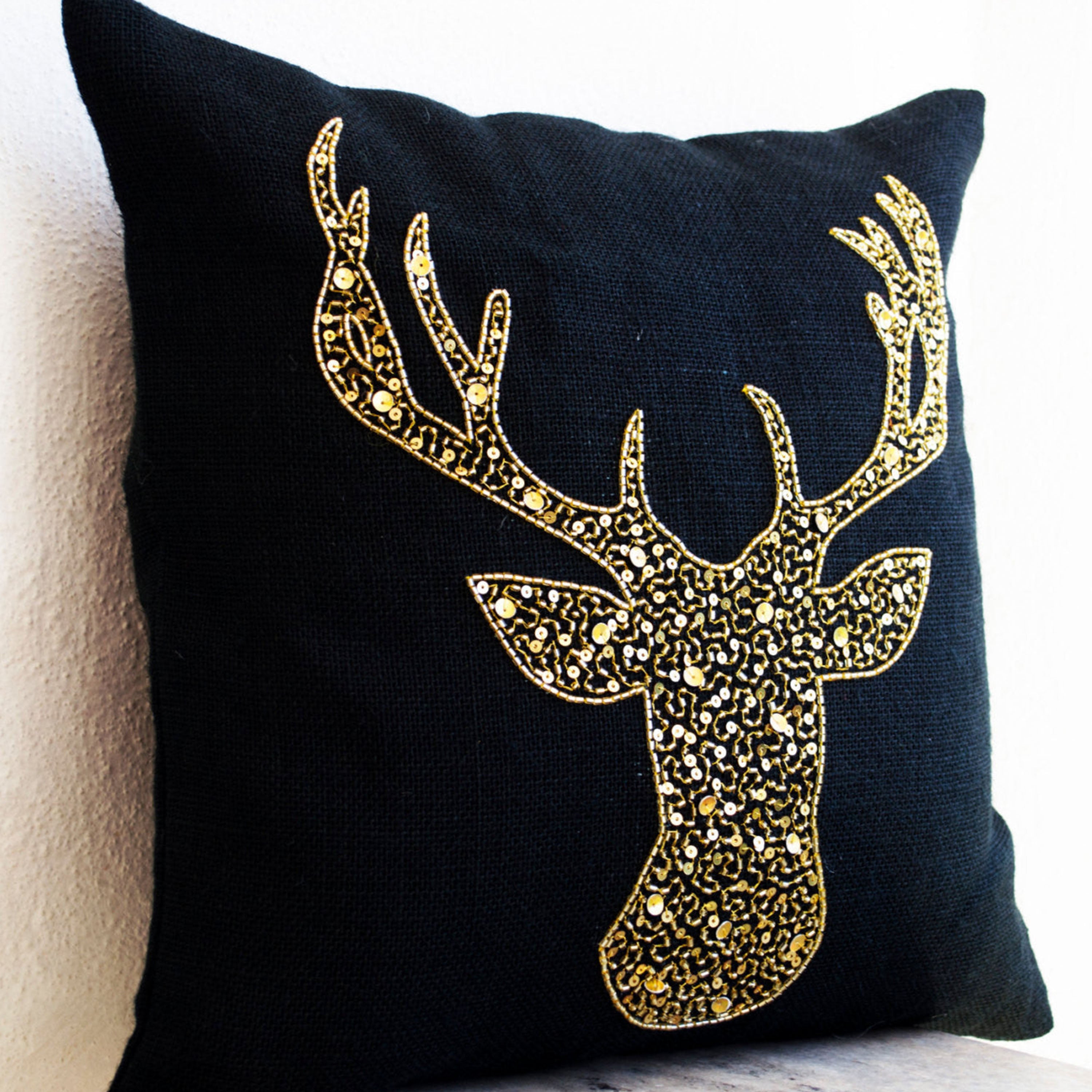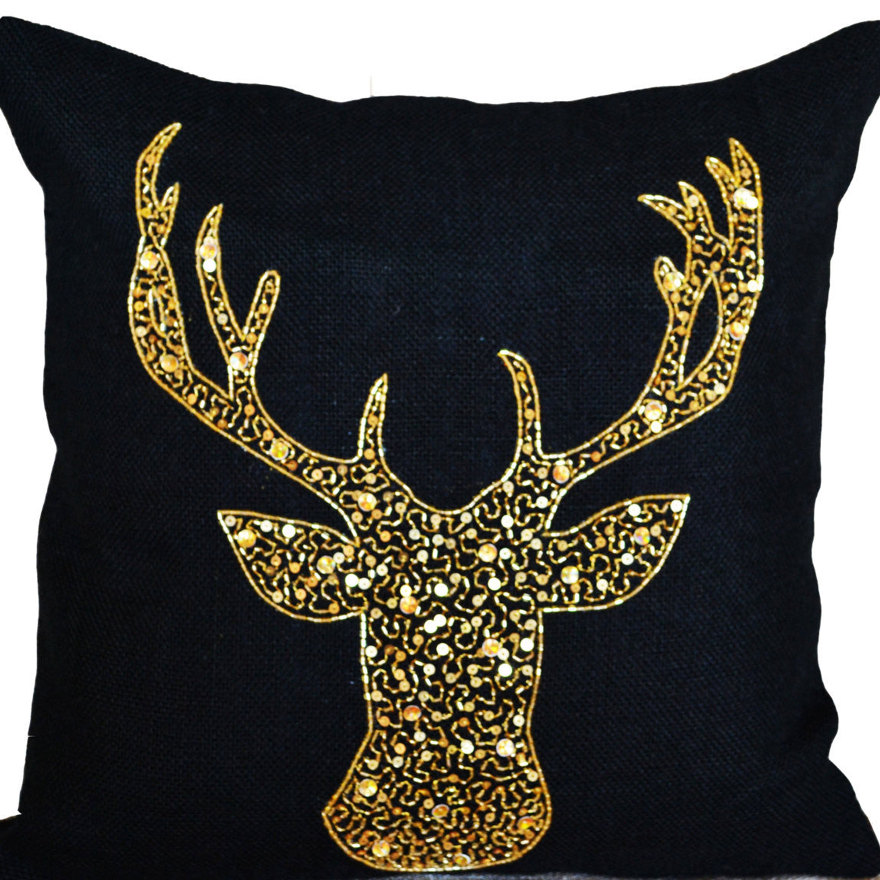 Deer pillow cover in gold sequin on rustic black burlap to create a chic look to your room décor. The decorative black burlap pillow with gold sequin accentuate the stag's majestic grandeur. This cushion is an elegant and spirited accent in burlap.