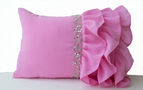 Pink ruffled throw pillows with swaths of georgette undulate across the distinctive whispy ruffle pillow, adding elegant depth and interest to your room decor. The sequins and crystal detail brings sparkle that makes this lumbar throw pillow very attractive.